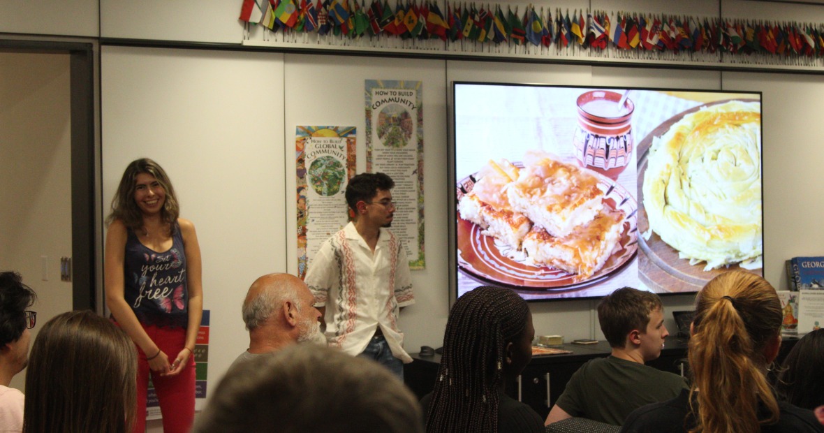 This time, David Stanley (the Global Kitchen Culinary Coordinator), Lilli Moorish ’25 (the Global Kitchen Peer Mentor), and the student presenters collaborated to make banitsa, a traditional Bulgarian pastry. This way, the audience was able to taste a slice of Bulgaria at the end of the presentation – and come back for seconds!