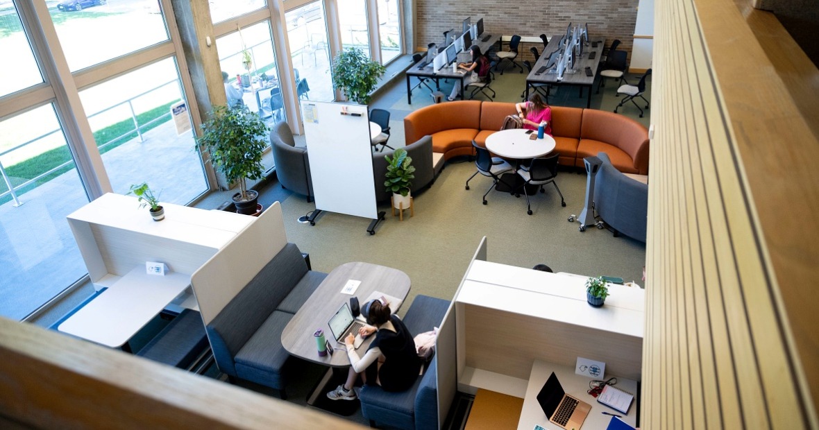 Burling and Kistle libraries have several places to study quietly, including individual study carrels and tables in both libraries. Burling also features armchairs, bike desks, bean bag chairs, laptop bars, sofas, and even jungle gyms. If you need to work with classmates or peer mentors, group study rooms are available in both Burling and Kistle.
